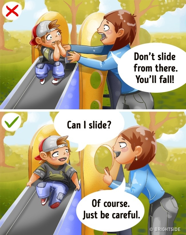 Një fëmijë rritet shumë i frikësuar nga largimi i prindërve të tij kur ata vendosin pengesa mes tyre dhe aktiviteteve të zakonshme. Ata kanë të ngulitur në kokën e tyre, për shembull: “Nëse unë rrëshqas, do të bie ose do të gris rrobat e mia” etj. Ja pse prindërit duhet të lënë fëmiëjt të lirë të shkojnë lirisht në sheshin e lojërave, dhe fëmija sigurisht nuk do të zgjedhë që të mos rrezikojë jetën e tyre për një kënaqësi momentale.