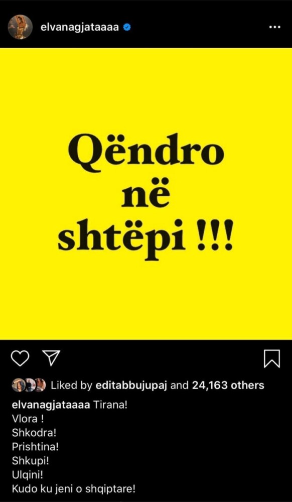 “Qëndro në shtëpi!!!” – është mesazhi që Elvana ka shpërndarë në Instagram.
