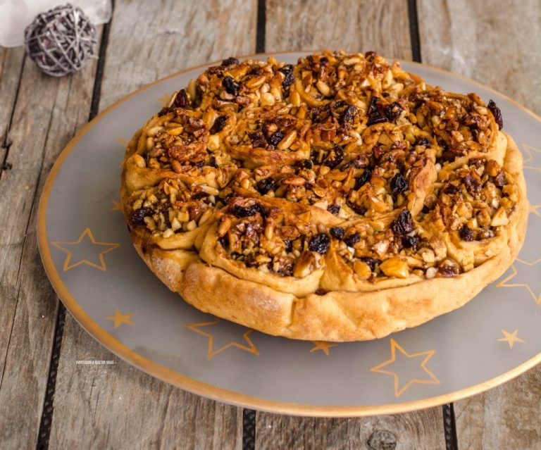 Përbërësit:500 gr miell,një lugë kafeje kripë, një lugë çaji sodë, 100 ml vaj ulliri, dy vezë,një lugë çaji kanellë, 100 gr rrush i thatë,100 gr arra,100 gr bajame,100 lajthi,100 gr sheqer,250 mjaltë (sipas dëshirës),150 – 200 ml ujë.
