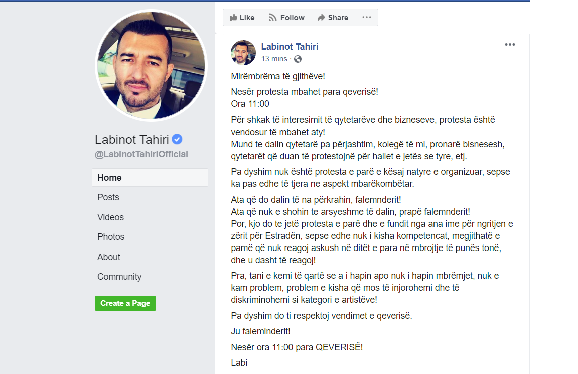 “Nesër ora 11:00 para QEVERISË me djal e me gruan se bashku per te drejtat tona, se kur po ndihmojna po na lavdojnë e kur është ne pyetje e ardhmja jonë mundohen disa të kritikojnë.” – ka shkruar Labi mes të tjerash në llogarinë e tij në Facebook.
